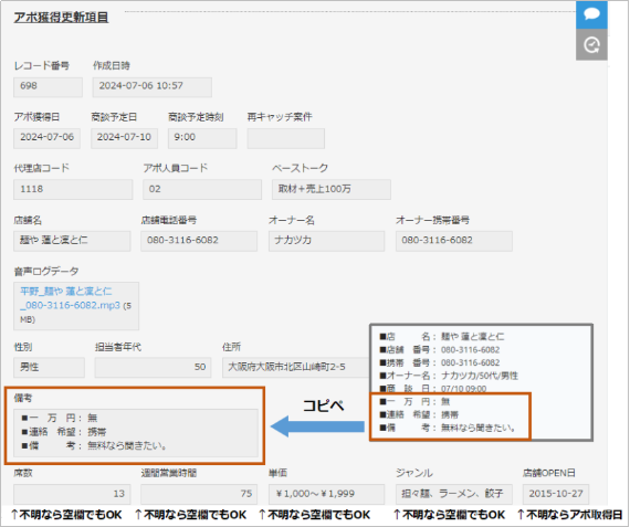 ・備考欄へ獲得テンプレの赤枠3項目を貼付